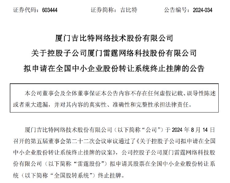 吉比特表示,雷霆股份根据其长期发展规划需要,为进一步提高决策效率,经充分沟通与慎重考虑,拟申请其股票在全国股转系统终止挂牌。