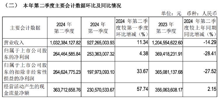 据半年报,吉比特2024年第二季度营收10.32亿元,环比上涨11.34%,同比下滑14.29;归母净利润为2.64亿元,环比增4.38%,同比下滑28.41%。