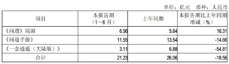 数据显示,3款产品中,仅有《问道》端游的流水在上半年增长,为6.56亿元,同比增长16.31%。《问道手游》和《一念逍遥(大陆版)》流水均出现下滑,其中《一念逍遥(大陆版)》下滑最为严重,为3.11亿元,金额同比减少超五成。