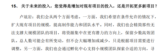 去年9月,卢竑岩曾提出,公司在团队吸收方面持谨慎态度,能不吸收的尽量不吸收,倾向于让团队保持独立,公司仅作为小股东。他认为保持制作人独立自主的创作非常重要,不占太多股份既能给团队留下未来融资的空间,又能激发团队的积极性。