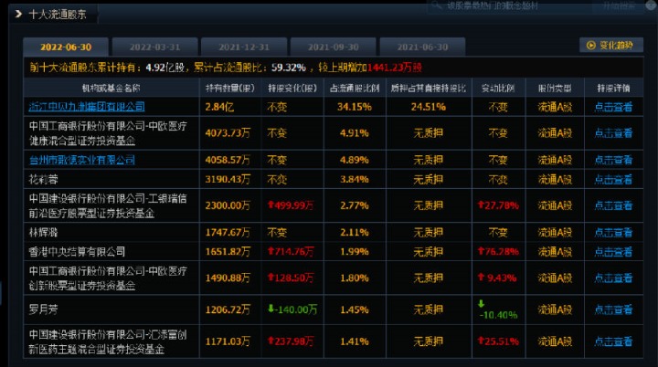 九洲药业前十大流通股股东(截至2022年6月30日)
