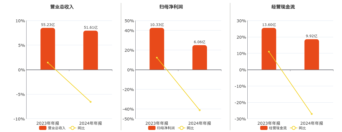 公司营业总收入为51.61亿元,较去年同报告期营业总收入减少3.63亿元,同比较去年同期下降6.57%。归母净利润为6.06亿元,较去年同报告期归母净利润减少4.27亿元,同比较去年同期下降41.34%。经营活动现金净流入为9.92亿元,较去年同报告期经营活动现金净流入减少3.69亿元,同比较去年同期下降27.10%。