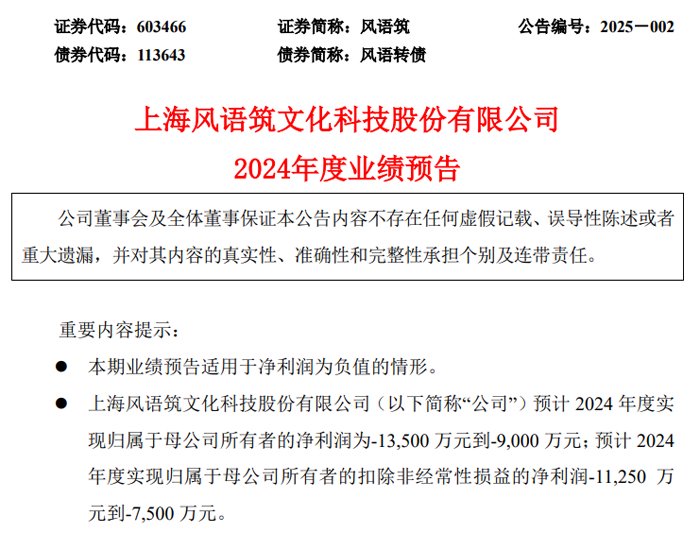 1月18日,上海风语筑文化科技股份有限公司发布2024 年度业绩预告,预计 2024 年度实现归母净利润亏损13,500 万元到亏损9,000 万元,与上年同期(法定披露数据)相比,将出现亏损。预计 2024 年度实现扣非净利润亏损11,250 万元到亏损7,500 万元,与上年同期(法定披露数据)相比,将出现亏损。