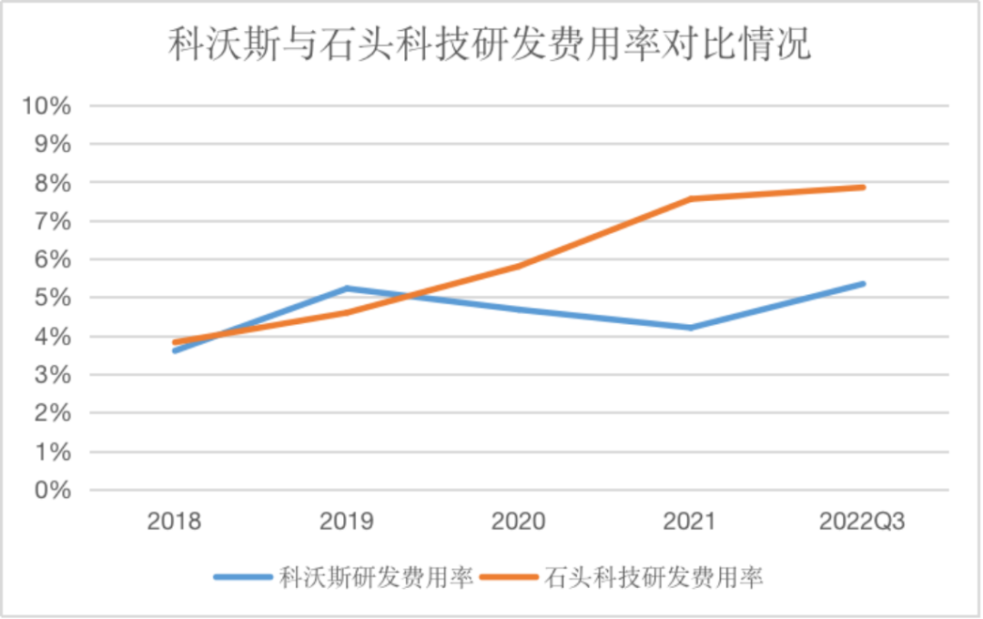 对比2018-2021年以及2022年前三季度,石头科技的研发费用率则分别3.82%、4.59%、5.8%、7.55%、7.85%;科沃斯目前的研发费用率明显低于石头科技。