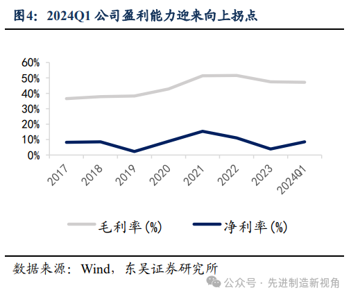 净利润增速慢于营收,2024Q1盈利水平迎拐点。2017-2023年公司归母净利润从3.8增长至6.1亿元,年复合增速为8.5%,其中2017-2021年为行业迅速扩张期,市场竞争相对温和,归母净利润年复合增速高达52%,销售毛利率及销售净利率逐年提升。但2022-2023年行业扩张速度放缓,洗地机行业产生价格战,导致公司净利润持续下降,销售毛利率相对保持稳定,但净利率下降幅度较大。2024Q1公司实现归母净利润3.0亿元,同比-8.7%,销售净利率8.6%,同比-1.5pct,环比+8.4pct,盈利水平迎来向上拐点。