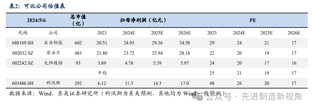 根据以上假设,我们得出公司2024-2026年营业总收入为178/203/229亿元,归母净利润为11.3/14.3/17.0亿元,当前市值对应PE为26/20/17倍。考虑到公司作为清洁家电龙头具备困境反转逻辑,在新产品扩张海外高增长的驱动下,公司有望获得快速增长。首次覆盖,给予“买入”评级。