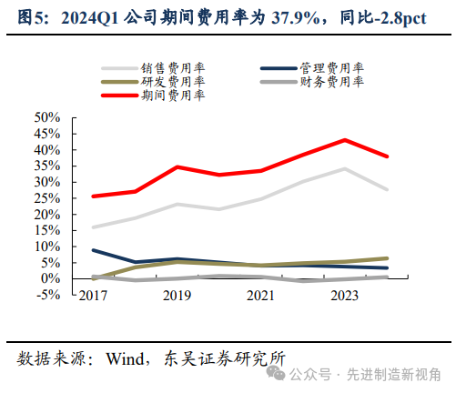 费用端,销售费用为利润主要拖累项,广告营销费用在销售费用中占比70%+。2017-2023年公司销售费用率持续提升,从27.1%提升至43.1%,是公司利润端的主要拖累项,其中销售费用为四费中最高,主要系公司为了提高消费者对产品的认知和接受度持续投放广告,2021-2023年广告费用在销售费用中占比70%以上。公司作为行业龙头,是行业内少数具备大额营销费用投放能力的企业,提高了消费者对清洁家电的认知和接受度,有利于市场的开拓和产品渗透率的提升。2024Q1公司期间费用率为37.9%,同比-2.8pct,显示了公司控费提效的决心,预计全年费用率下降势头确定。