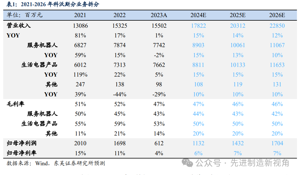 服务机器人:受益于产品渗透率提升公司补齐产品矩阵,预计2024-2026年营收增速分别达15%/13%/10%,毛利率分别达44%/43%/42%;