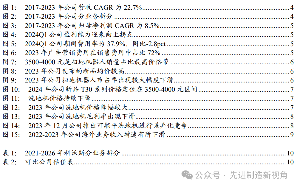 2023年公司实现营收155.0亿元,同比+1.2%,归母净利润为6.1亿元,同比-64.0%,单Q4实现营收49.7亿元,同比-4.4%,归母净利润839万元,同比-98.5%。公司业绩承压主要系国内消费市场整体复苏乏力叠加行业竞争加剧影响。分产品看:①服务机器人:2023年营收77.4亿元,同比-1.7%,其中科沃斯品牌收入76.8亿元,同比-1.5%,行业增速为5.1%,公司收入增速低于行业增速主要系公司在中低价格段降本款产品布局有所缺失,导致公司扫地机器人线上份额同比下降6.8pct,线下零售份额同比下降5.7pct;②智能生活电器:2023年营收76.6亿元,同比+4.8%,其中添可品牌收入72.7亿元,同比+5.2%。2024年Q1公司实现营收34.7亿元,同比+7.4%,归母净利润3.0亿元,同比-8.7%,扣非归母净利润2.9亿元,同比+0.3%,重回正增长。