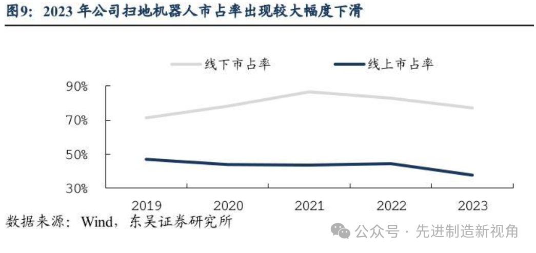 公司是国内清洁家电龙头,2023年公司扫地机器人市占率线上份额37.6%,线下份额77.1%,占据市场主导地位。公司补齐产品矩阵后有望重新把握行业增量机遇,同时加大降本力度,加强海外销售渠道覆盖能力,有望迎来底部反转。