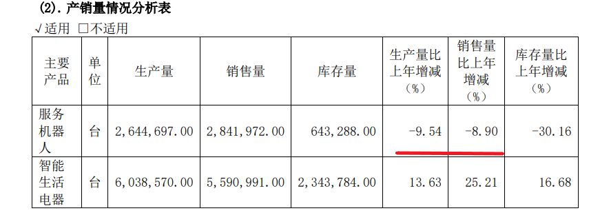 从年报披露的情况看,其在科沃斯品牌服务机器人的销售上压力更大。该类产品去年的产量和销量,出现了双下滑。