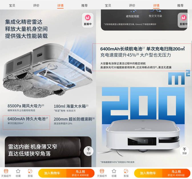 其中,消费者史女士告诉《中国消费者》杂志记者,她于2024年1月在天猫超市购买了一台科沃斯X2扫地机器人,共花费4652元。到货试用时发现机器人未扫完就出现“电池电量不足15%需返回充电”的提示。该商家在详情页宣称该产品配备了“6400mAh持久大电池”,产品“单次扫拖200平方米”且“大容量电池保证清洁过程中的稳定续航”。史女士表示,现实情况是单次扫拖86平方米就出现电量不足的情况。截至目前,上述问题仍未得到有效解决。