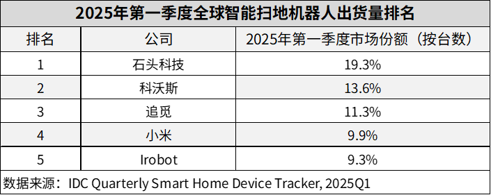 IDC报告显示,当前扫地机器人头部厂商市场份额集中度加剧,2025年一季度,Top5厂商出货已占到整体市场的63.4%,较去年同期提升3.5%。其中,石头科技(688169.SH)以98.2万台出货量、19.3%的市场份额稳居全球第一,同比增长高达50.7%;科沃斯(603486.SH)则出货69.3万台,同比增长11%。