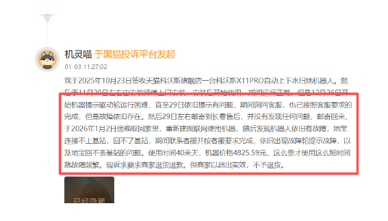 一名消费者投诉表示,其于2025年10月23日签收天猫科沃斯旗舰店一台科沃斯X11PRO自动上下水扫地机器人。于11月20日左右由安装师傅上门安装,安装后开始使用,期间运行正常。但12月26日机器提示驱动轮运行困难,咨询客服并按照要求完成,故障依旧存在。12月29日左右邮寄到长春售后,并没有发现任何问题。