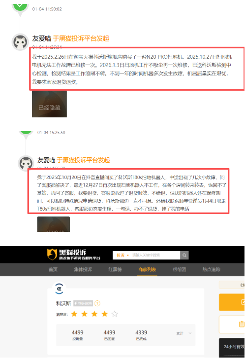 还有消费者投诉称,其于2025年2月26日在淘宝天猫科沃斯旗舰店购买了一台N20 PRO扫地机。2025年10月27日扫地机电机无法工作故障已维修一次。2026年1月3日扫地机工作不吸尘再一次维修,已送科沃斯检测中心检测,检测结果是工作滚刷不转。“不到一年的时间机器多次发生故障。”该消费者说。