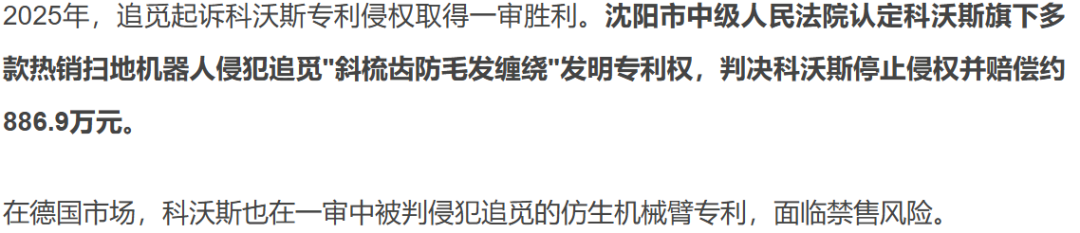 另一方面,科沃斯在专利纠纷中屡屡受挫。结合天眼查及《磐石之心聊财经》报道,2025年追觅起诉科沃斯专利侵权取得一审胜利,沈阳市中级人民法院认定科沃斯旗下多款热销扫地机器人侵犯追觅“斜梳齿防毛发缠绕”发明专利权,判决科沃斯停止侵权并赔偿约886.9万元。