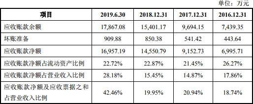 2015年至2019年1-6月,八方股份应收账款余额分别为6048.40 万元、7439.35万元、9694.15万元、1.54亿元、1.79亿元;应收账款净额分别为5703.53万元、6995.71万元、9152.73万元、1.46亿元、1.70亿元;占营业收入比例分别为20.90%、17.86%、14.87%、15.45%、28.18%。