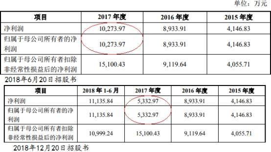 八方股份此前分别于2018年6月20日、12月20日各发布一版招股书,但两版招股书中2017年的净利润数据却相差近5000万元。2018年6月20日招股书中,八方股份2017年归母净利润为1.03亿元,2018年12月20日招股书中,八方股份2017年归母净利润为5332.97万元。两版数据相差4941.00万元。2018年12月20日版本招股书中的数据与公司2019年最新招股书中数据相同。