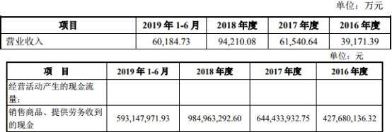 2015年至2019年1-6月,八方股份营业收入分别为2.73亿元、3.92亿元、6.15亿元、9.42亿元、6.02亿元;销售商品、提供劳务收到的现金分别为2.80亿元、4.28亿元、6.44亿元、9.85亿元、5.93亿元。