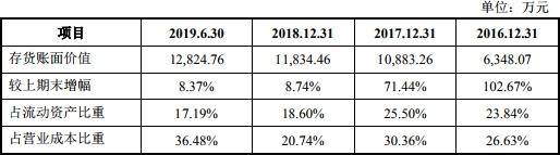 2015年至2019年1-6月,八方股份存货账面价值分别为3132.26万元、6348.07万元、1.09亿元、1.18亿元、1.28亿元;占流动资产比重分别为21.47%、23.84%、25.50%、18.60%、17.19%。