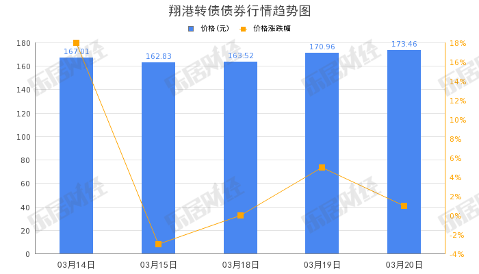 乐居财经 03月21日,“翔港转债”(113566)早盘拉高,截至10:12,涨幅20%,报208.15元。总成交量8.07万手,成交额1.66亿元。