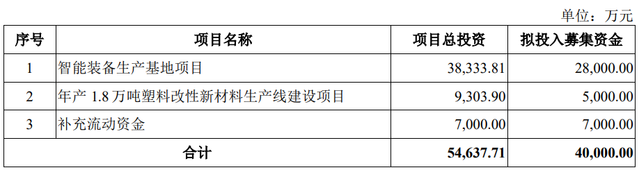 祥和实业 10月31日披露的向不特定对象发行可转换公司债券证券募集说明书(申报稿)显示,公司拟发行可转债募集资金总额不超过人民币40,000.00万元(含40,000.00万元),扣除发行费用后拟用于智能装备生产基地项目、年产1.8万吨塑料改性新材料生产线建设项目、补充流动资金。