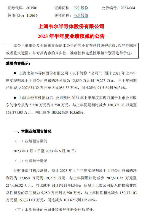 扣除非经常性损益后,韦尔股份预计2023年上半年度实现归属于上市公司股东的净亏损为5250万元到8250万元,与上年同期相比减少150371.03万元至153371.03万元,同比减少103.62%到105.68%。