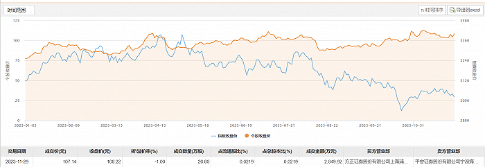 11月29日,韦尔股份今日大宗交易成交26.6万股,成交额2849.92万元,占当日总成交额的1.69%,成交价107.14元,较市场收盘价折价1.0%。
