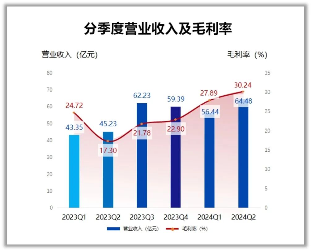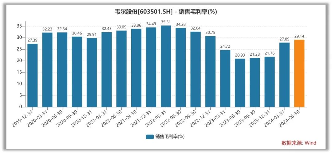 韦尔股份的毛利率2023见底,2024年上半年公司毛利率为29.14%,同比提升8.21个百分点,相比2022年同期还低5.14个百分点。