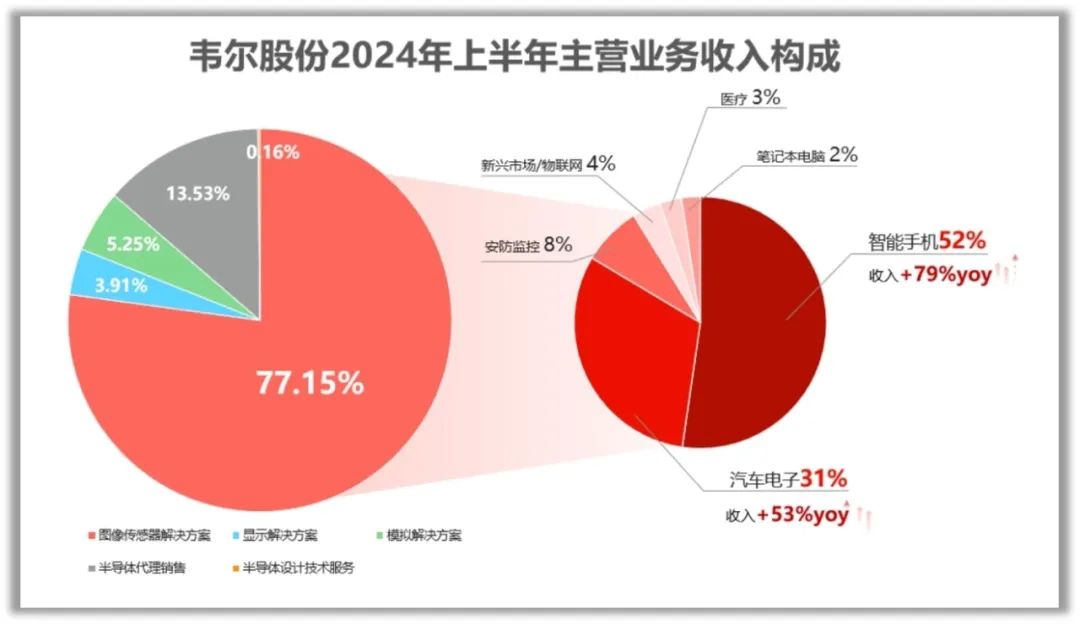 今年上半年韦尔的增长表现,2024上半年公司实现营业收入120.91亿元,同比增长36.50%;图像传感器解决方案业务实现93.12亿元的销售收入,占主营业务收入的77.15%的份额,相比去年同期增长了49.90%;模拟解决方案业务上也取得了显著的成绩,实现了6.34亿元的销售收入,占主营业务收入的5.25%,同比增长了24.67%。显示解决方案业务则出现了下滑,销售收入为4.72亿元,占主营业务收入的3.91%,同比下降了28.57%。