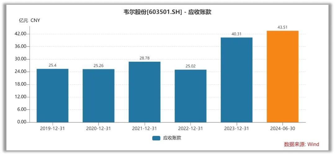 《蓝筹企业评论》注意到,韦尔股份的应收账款处于逐年攀升的趋势2019年-2024半年报,营业收入分别为:136.32亿元、198.24亿元、241.04亿元、200.78亿元、210.21亿元和120.91亿元;应收账款分别为25.40亿元、25.26亿元、28.78亿元、25.02亿元、40.31亿元2024年上半年,公司应收账款净额达到43.51亿元,占期末流动资产的22.04%,较上年年末增长7.92%。