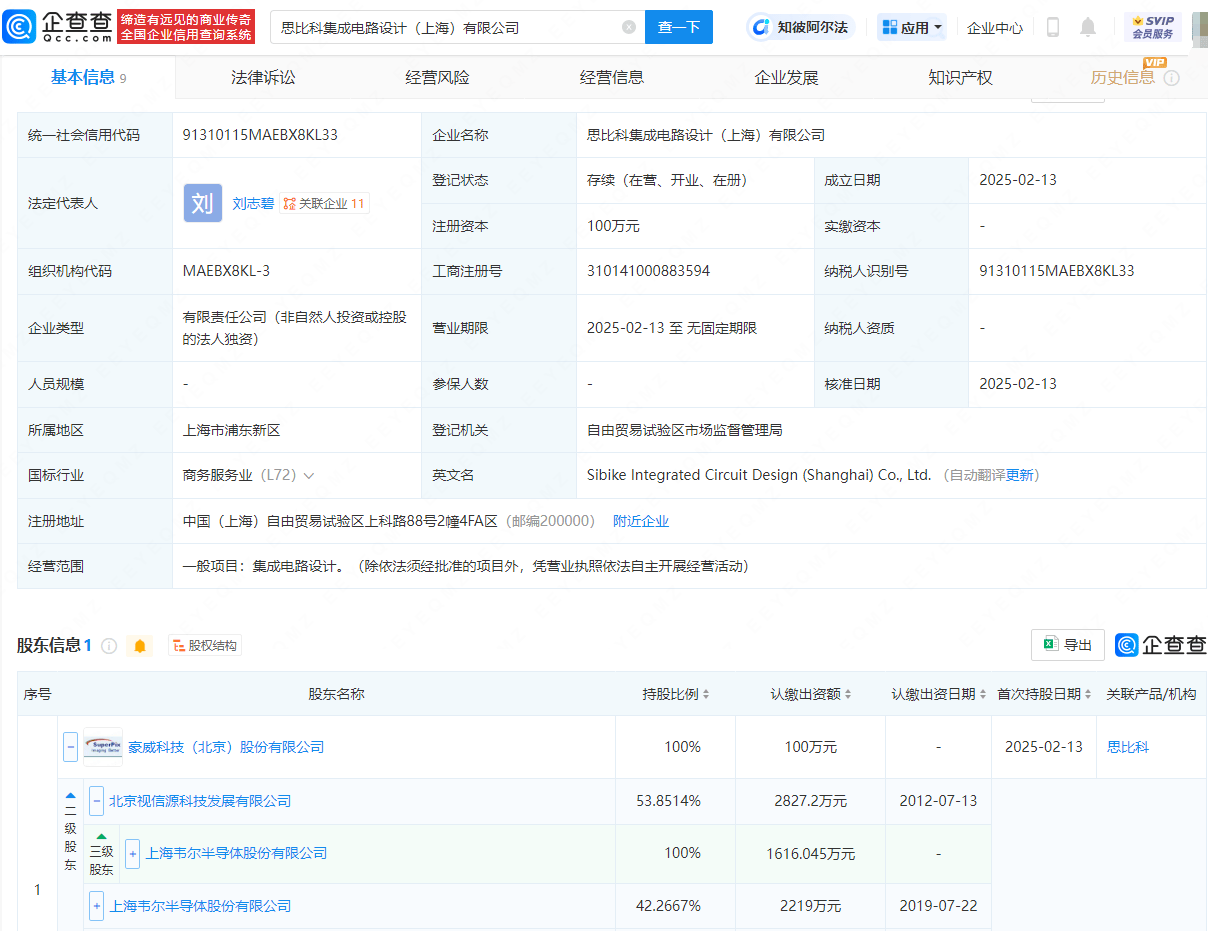 近日,思比科集成电路设计(上海)有限公司成立,法定代表人为刘志碧,注册资本为100万元,经营范围包含:集成电路设计。股权穿透显示,该公司由韦尔股份(603501)旗下豪威科技(北京)股份有限公司全资持股。
