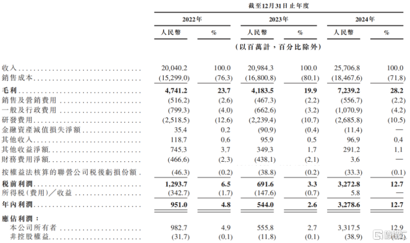 2022年、2023年、2024年(报告期),豪威集团的收入分别为200亿元、210亿元、257亿元;同期净利润分别为9.51亿元、5.44亿元、32.79亿元,分别占各年度收入的4.8%、2.6%及12.7%。
