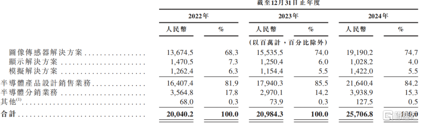 从收入类别来看,豪威集团的大部分收入来自半导体设计销售业务,2024年,图像传感器解决方案、显示解决方案、模拟解决方案的收入占比分别为74.7%、4%、5.5%;半导体分销业务的收入占比为15.3%。
