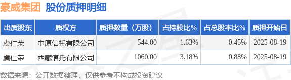 豪威集团(603501)8月20日公开信息显示,股东虞仁荣向中原信托有限公司、西藏信托有限公司合计质押1604.0万股,占总股本1.33%。质押详情见下表: