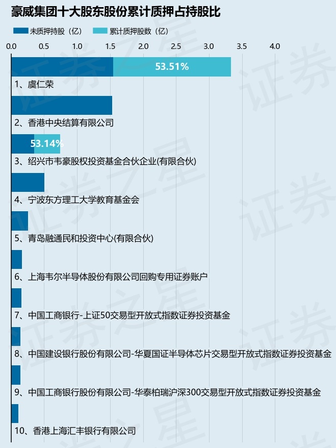 截止本公告日,股东虞仁荣已累计质押股份1.78亿股,占其持股总数的53.51%,股东绍兴市韦豪股权投资基金合伙企业(有限合伙)已累计质押股份3939.6万股,占其持股总数的53.14%。本次质押后豪威集团十大股东的累计质押股份占持股比例(占持股比例的计算以公司最新一期财务报表公布的十大股东的持股总数为基准)见下图: