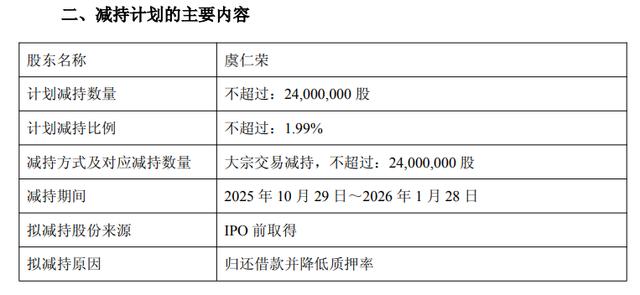 公告显示,虞仁荣目前持有公司 3.33 亿股股份,占总股本 27.65%,股份来源于 IPO 前取得,且此次减持符合其此前作出的股份限售及减持意向承诺。截至 9 月 26 日公告披露,虞仁荣及其一致行动人累计质押股份 1.98 亿股,占其持股的 48.54%及公司总股本的 16.44%。