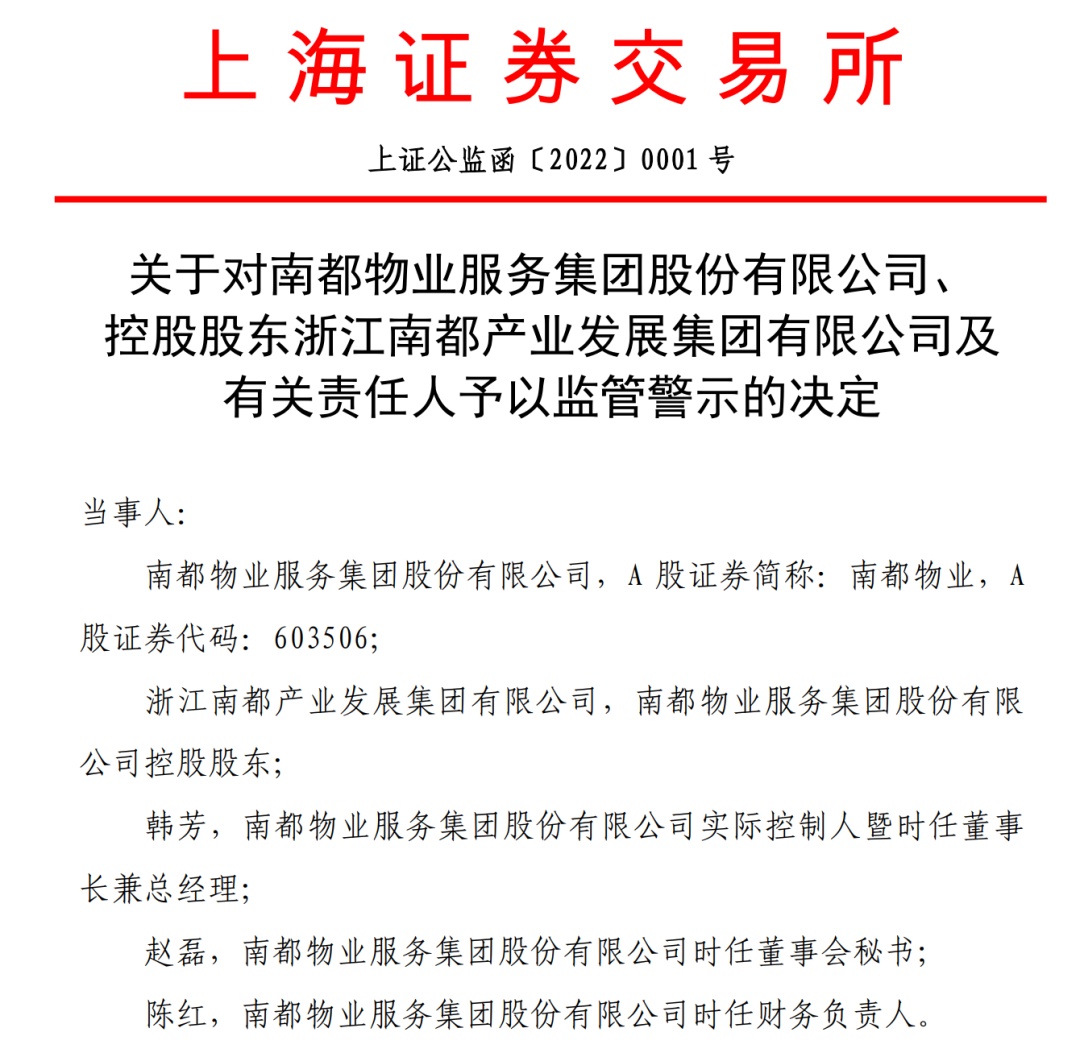 2022年1月19日,上交所发布了《关于对南都物业(603506)服务集团股份有限公司、控股股东浙江南都产业发展集团有限公司及有关责任人予以监管警示的决定》的监管函,编号为【2022】0001号。