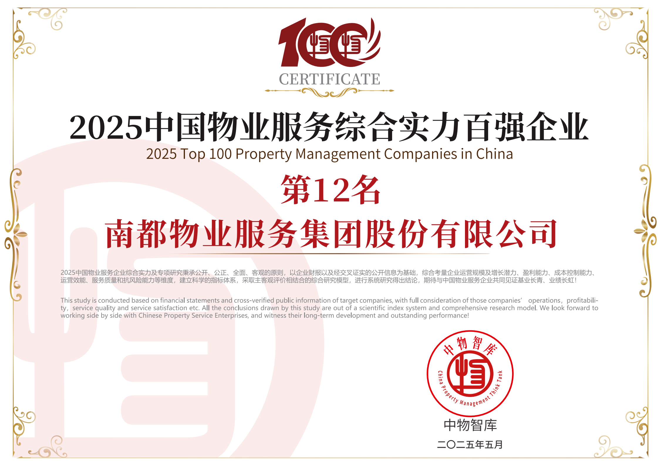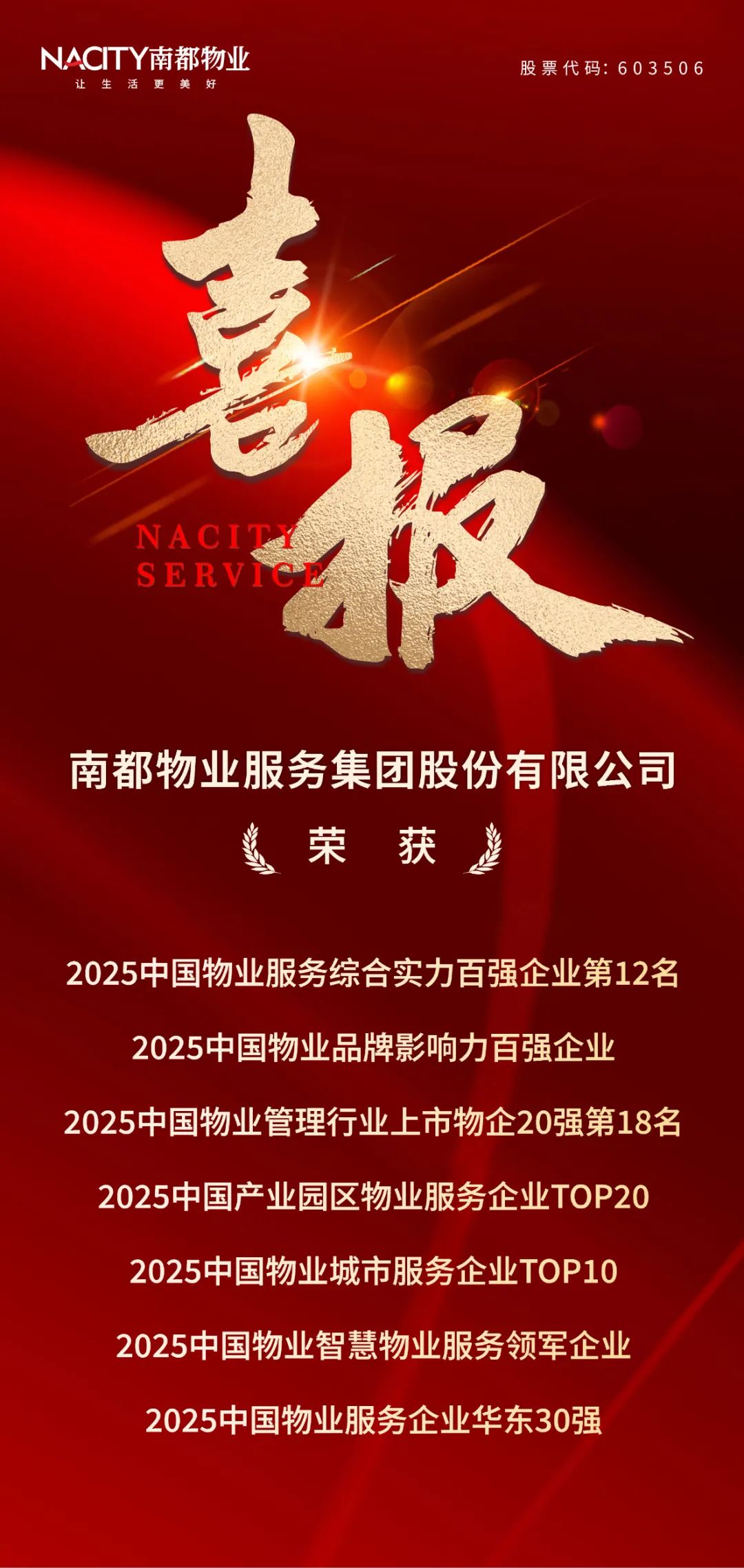 会上重磅发布了《好服务新价值:2025中国物业服务企业综合实力研究报告》,同期揭晓“2025中国物业服务综合实力百强企业”等榜单。南都物业服务集团股份有限公司荣获“2025中国物业服务综合实力百强企业第12名”“2025中国物业品牌影响力百强企业”“2025中国物业管理行业上市物企20强第18名”“2025中国产业园区物业服务企业TOP20”“2025中国物业城市服务企业TOP10”“2025中国物业智慧物业服务领军企业”“2025中国物业服务企业华东30强”奖项。