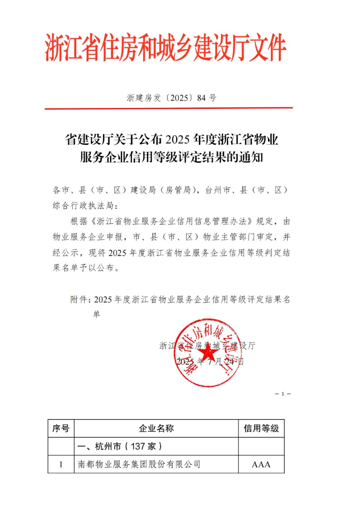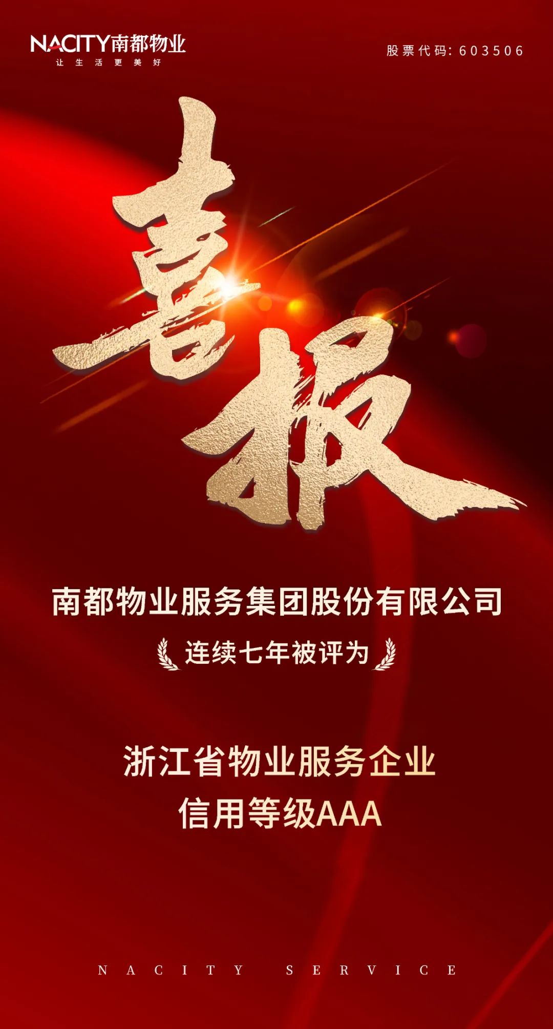 南都物业连续七年荣获浙江省物业服务企业信用等级AAA评定。该评选由浙江省住房和城乡建设厅组织。以此荣誉为新的起点,南都物业将继续秉承诚信理念,恪守“让生活更美好”的企业使命,以品质为基石,以创新为动能,以科技为引擎,持续引领行业高质量发展。