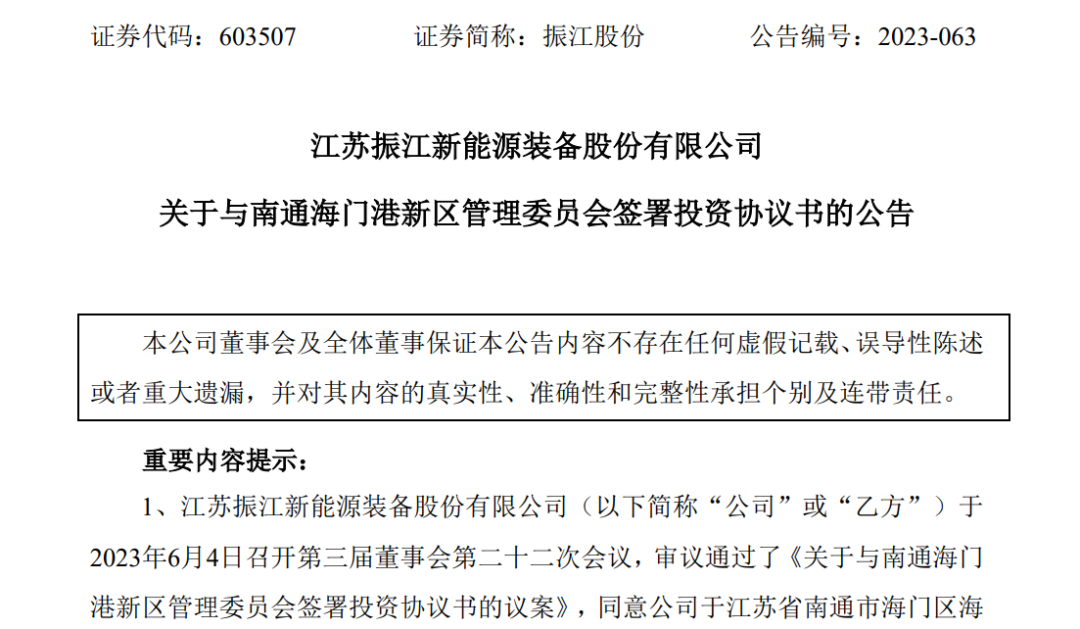 6月6日,江苏振江新能源装备股份有限公司(以下简称“振江股份”或“公司”)发布《关于与南通海门港新区管理委员会签署投资协议书的公告》。
