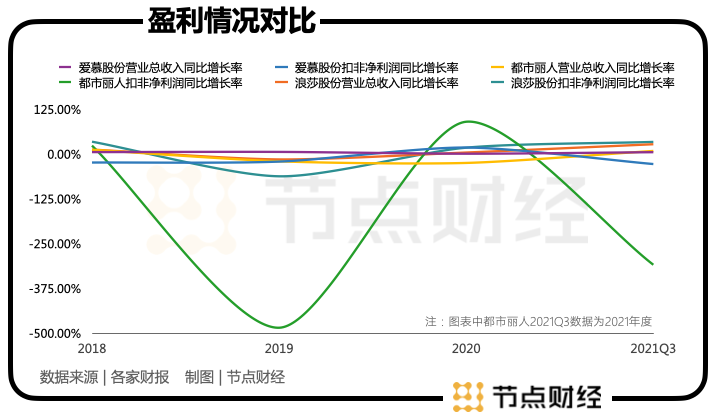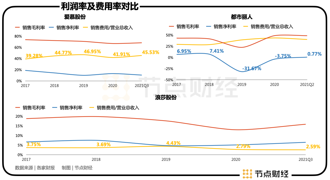 放置行业来看,增收不增利似是其他公司也在经历的事。比之爱慕股份,都市丽人的财务数据更差,近几年营收不稳定,扣非归母净利润少长多跌;浪莎股份情况稍好一些,2021Q3营收及扣非归母净利润双增长,但其主营业务的侧重点和爱慕股份及都市丽人有所不同,其进入了传统的销售旺季。