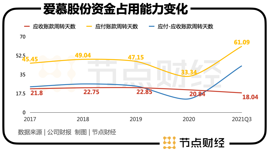 从代表一定市场地位的市场议价能力上看,爱慕股份在2020年到达低谷后,2021Q3出现较大程度的好转,主要来源于对上游议价能力的提升。