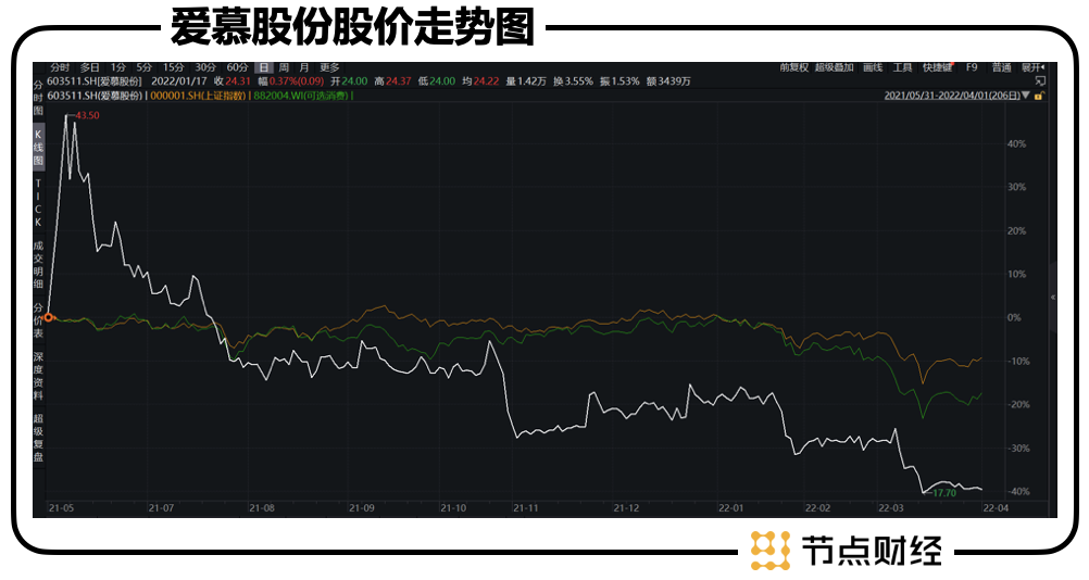 上市不足一年的爱慕股份如今已跌破发行价,从最高点回撤60%左右。