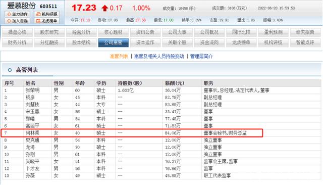 外界对于财务总监的薪酬一直颇为好奇,东方财富网数据显示,何林渠在爱慕股份的薪酬为84.06万。而该公司董事长张荣明的薪酬为36.04万,三位董事宋玉惠、郑崝和高丽平的薪酬分别为33.47万、77.48万和71.83万。可见何林渠的薪酬在高管中不算低。