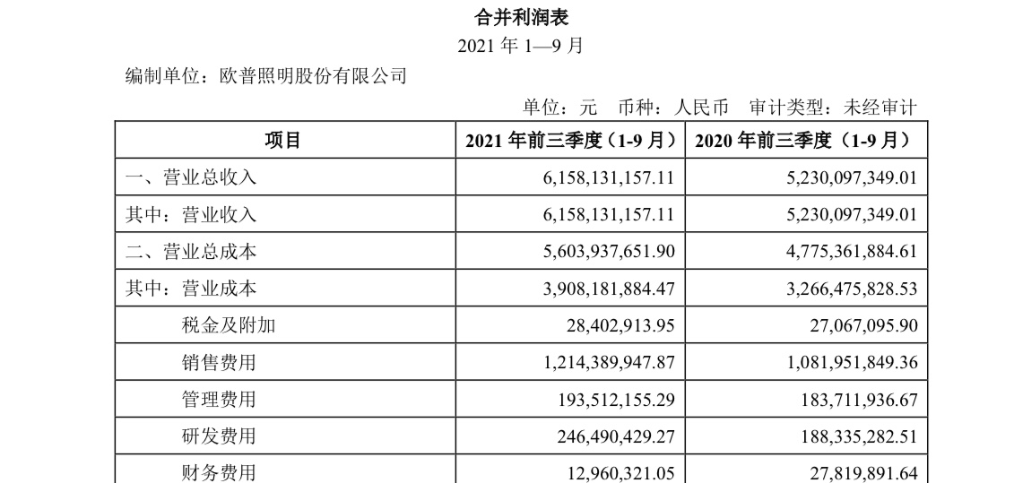 除财务费用外,欧普照明的各项费用同比有所增加。三季报显示,2021年前三季度,欧普照明营业成本为39.08亿元,2020年同期为32.66亿元;销售费用为12.14亿元,2020年同期为10.82亿元;管理费用为1.94亿元,2020年同期为1.84亿元;研发费用为2.46亿元,2020年同期为1.88亿元。