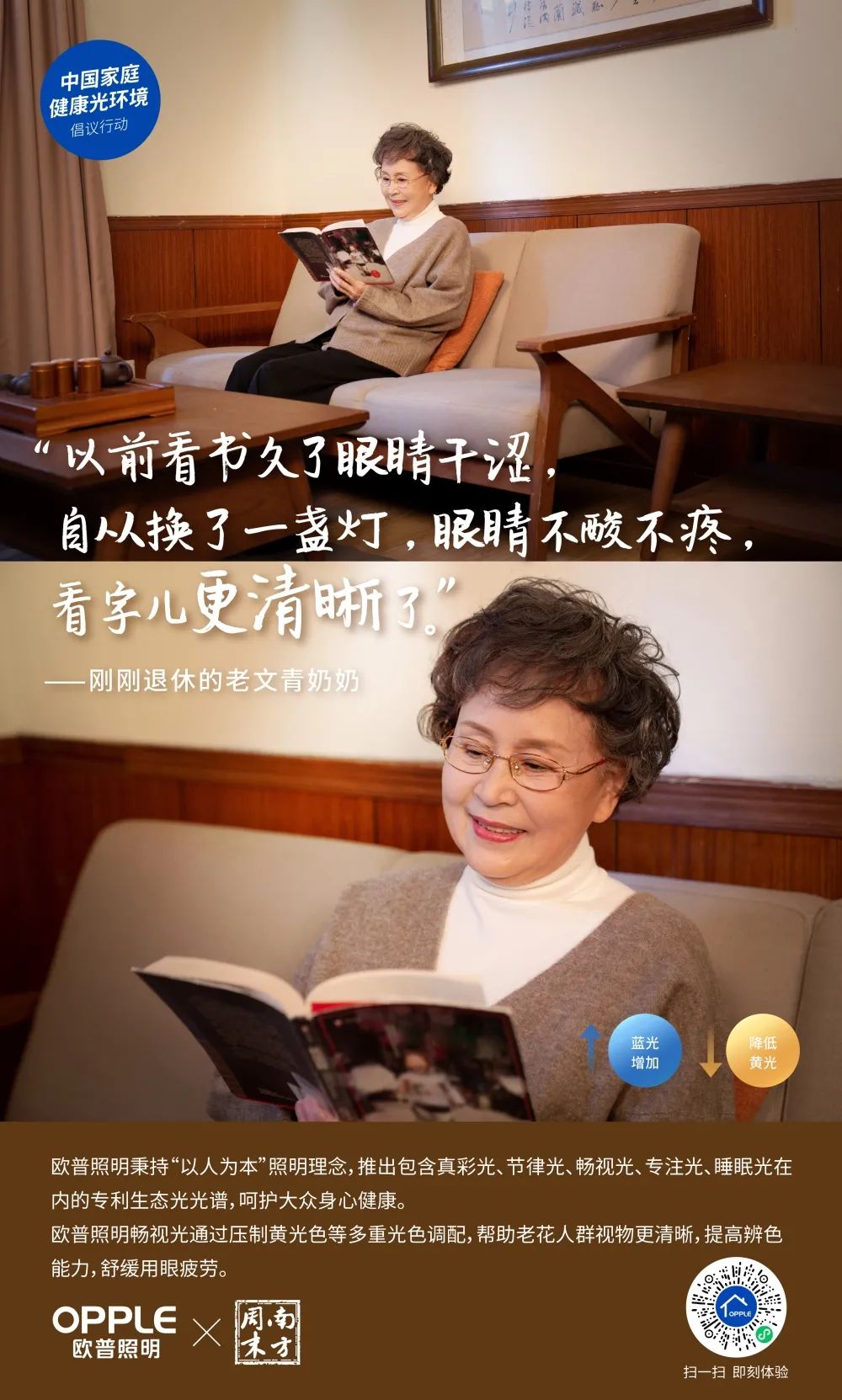不只是儿童、年轻群体的用光需求,中老年人的家居用光需求也与日俱增。有研究表明,45岁开始越来越多的人开始感到视物不清晰,视觉系列开始衰退,老花人群逐渐年轻化。欧普照明研发人员通过对眼睛结构及视觉和系统的多重分析,找到了帮助老花人群更清晰视物的欧普畅视光,能帮助老花人群提高辨色能力,舒缓用眼疲劳。