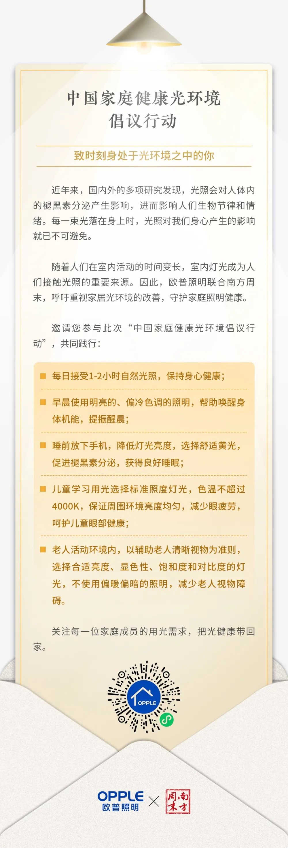了解光健康知识,正确认知“健康光”,不仅需要社会层面专业知识的科普,更需要照明企业推出切实有效的照明方案,帮助用户通过健康光照实现生活品质的提升。欧普照明积极担起中国健康光环境的企业责任,与媒体以及心理领域的专业人士共同携手,大众关注并重视家庭健康光环境对身心健康的影响,并以多元化的产品,满足消费者的光健康需求,助力健康生活的可持续。