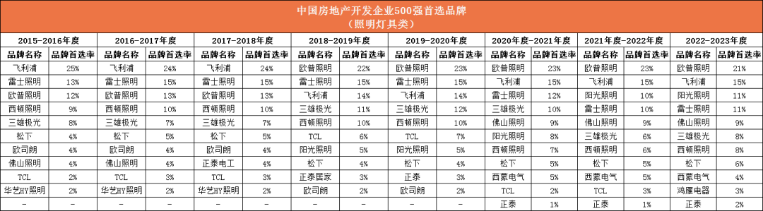 根据上述表格可知,今年欧普照明以21%的品牌首选率,连续5年蝉联“中国房地产开发企业综合实力TOP500照明灯具类首选装饰材料类品牌”第一名。