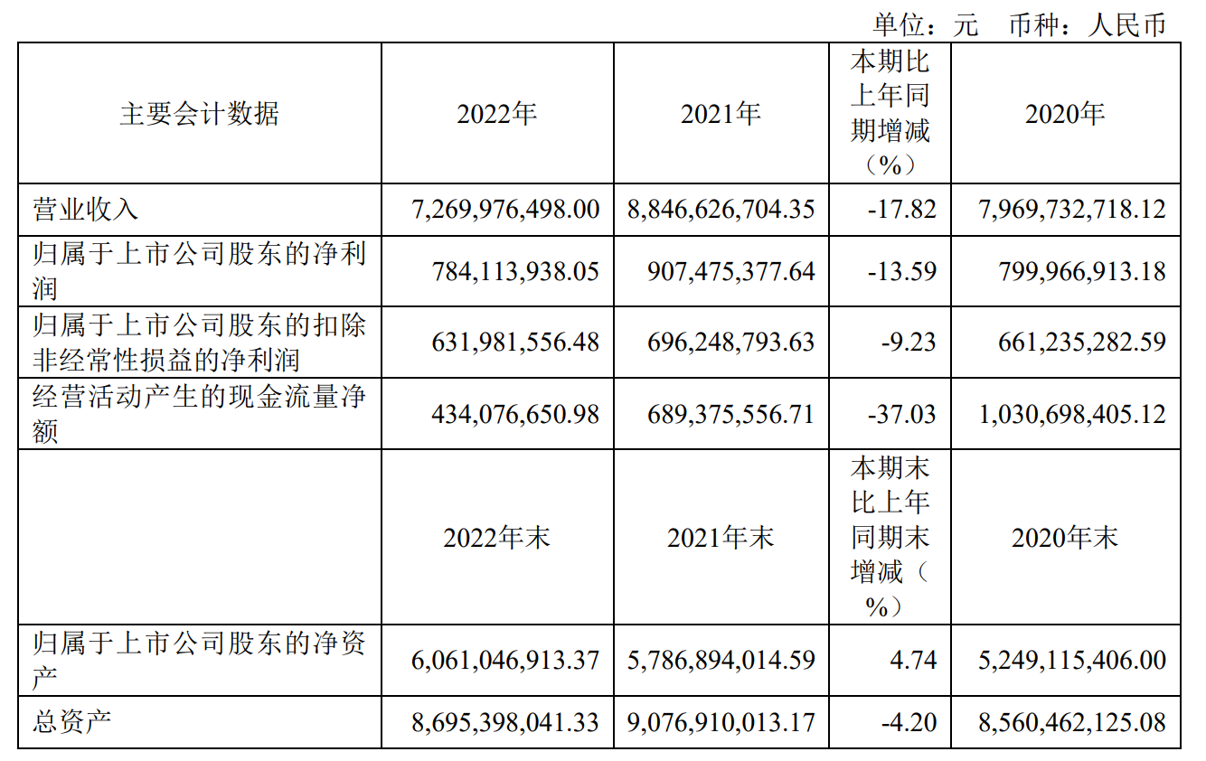 根据公告,2022年度公司营收72.7亿元,同比降17.82%;归属于上市公司股东的净利润7.84亿元,同比降13.59%。